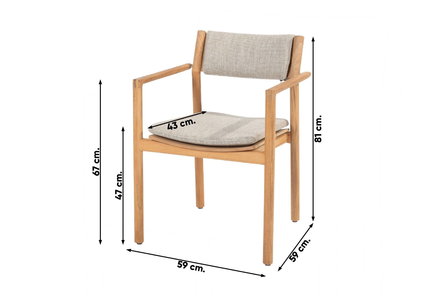 De Levi tuinstoel is volledig gemaakt teakhout. Dit is een hardhout soort die vaak gebruikt wordt voor tuinmeubelen. Het teakhout zal door de weersinvloeden een grijze kleur krijgen en wat scheurtjes vertonen. Dit proces doet niet af aan de kwaliteit van de Levi stoel! Eventueel kan je meer lezen over de onderhoudsmogelijkheden van het teakhout aan de linkerzijde onder het tabje 'onderhoud'. De meegeleverde kussens zijn gemaakt van Olefin met een vulling van traagschuim. Hierdoor kunnen de kussens gewoon tegen een regenbuitje, zo kan jij onbezorgd genieten van jouw Levi tuinstoel! We raden wel aan om de kussens droog op te bergen wanneer deze langere tijd niet gebruikt worden. Gebruik je de hele stoel niet? De stoelen zijn stapelbaar waardoor je gemakkelijk opbergt!