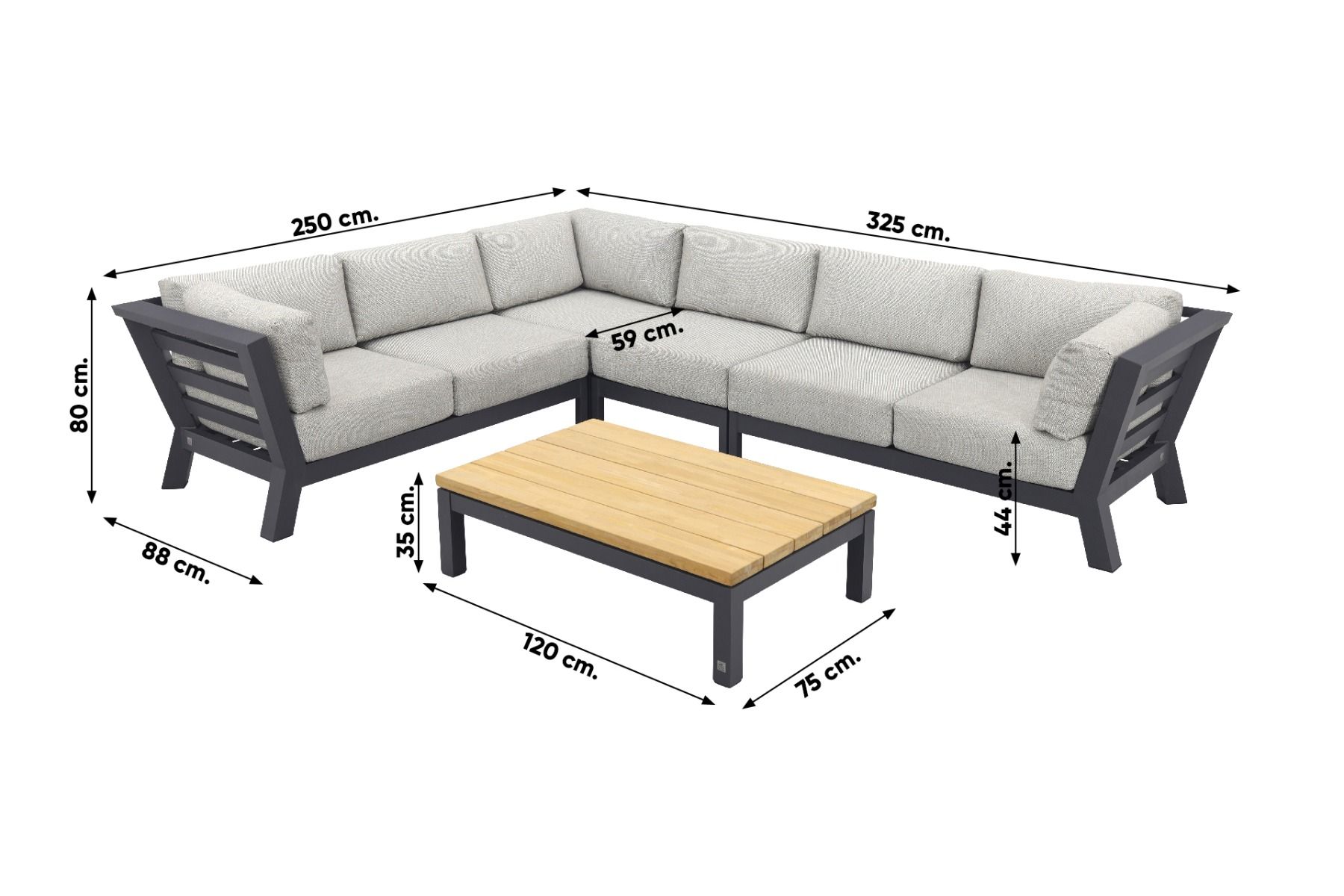 Het frame van de Captiol loungetafel is van aluminium dat gecoat is in het antraciet. Aluminium heeft als voordeel dat het erg stevig is en onderhoudsvriendelijk door de antraciet coating. Het tafelblad is van teak hout. Teak hout is een harde houtsoort dat tegen weersinvloeden kan. Wel zal het hout gaan vergrijzen en lichte haarscheurtjes vertonen. Dit geeft het teak hout dan ook zijn natuurlijke charme. Om vlekken te voorkomen kun je de teak tafel ook behandelen met een teak shield. Dit onderhoudsmiddel zorgt er tevens voor dat het teak water- en vuilafstotend is.
