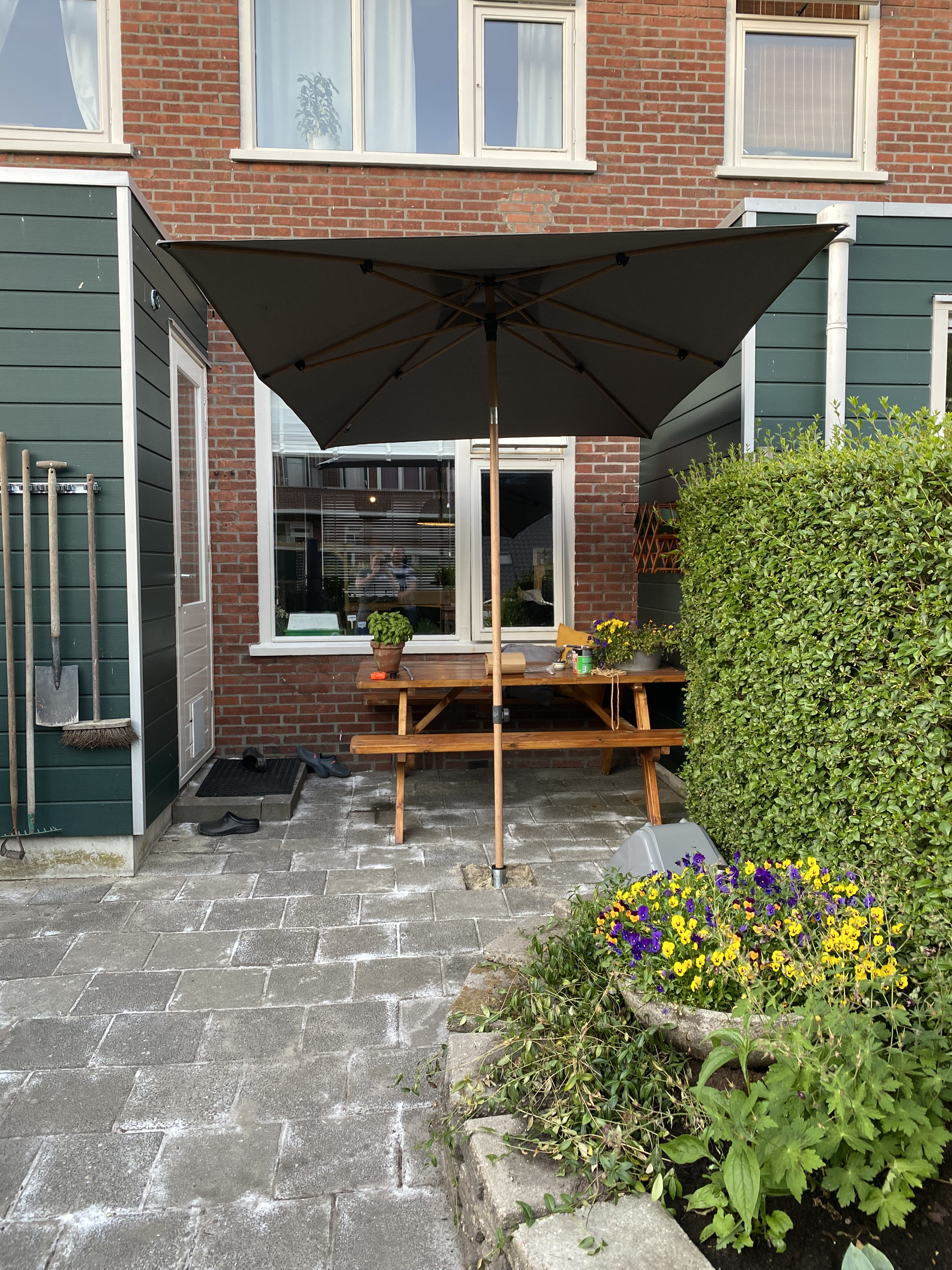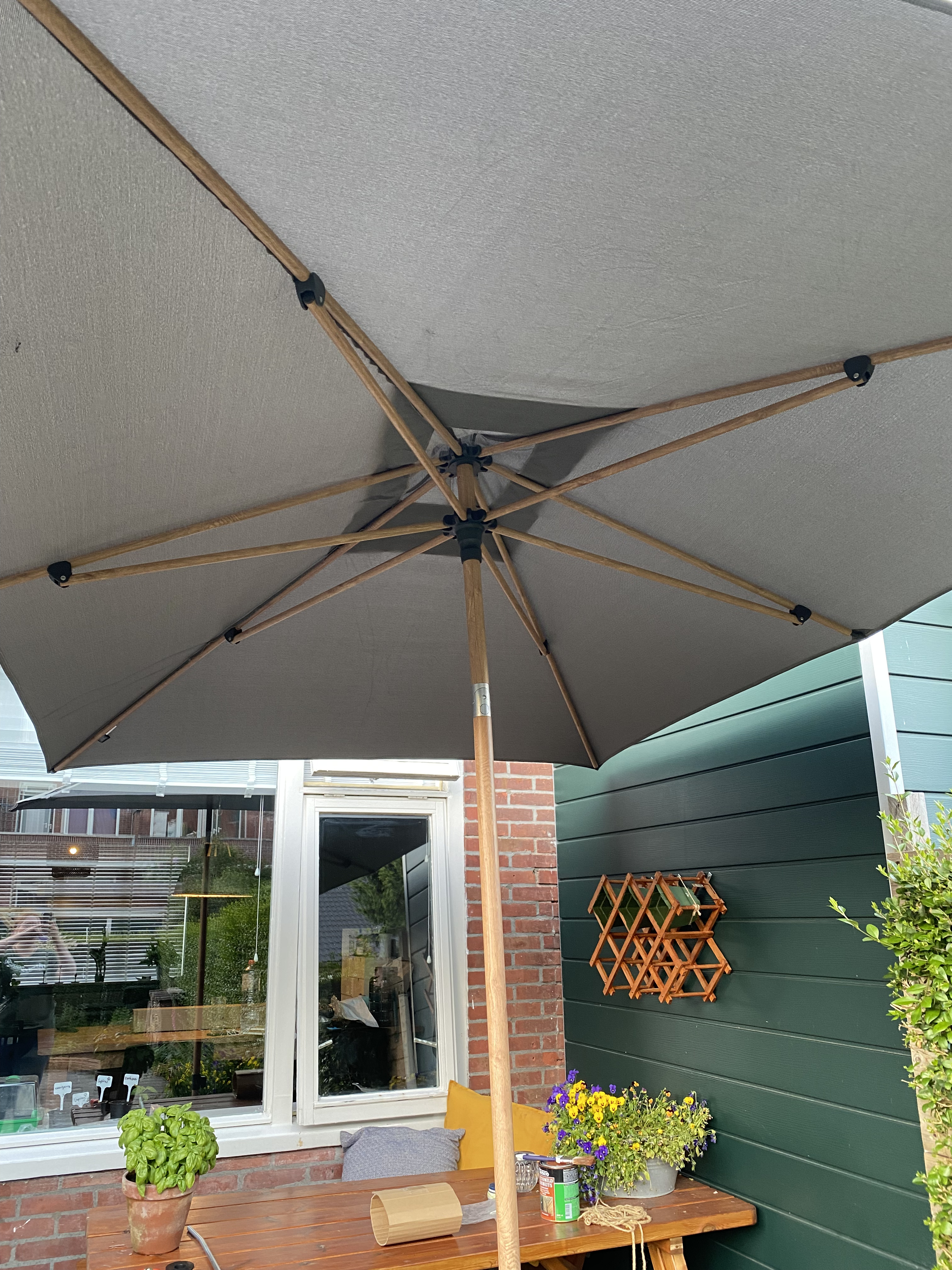 Het doek van een parasol is het beste schoon te maken met lauw water met zachte zeep, gebruik hiervoor een borstel. Wij adviseren u om uw parasol te beschermen met een parasolhoes. Door gebruik van een parasolhoes beschermd u, uw parasol tegen vuil en verkleuring.