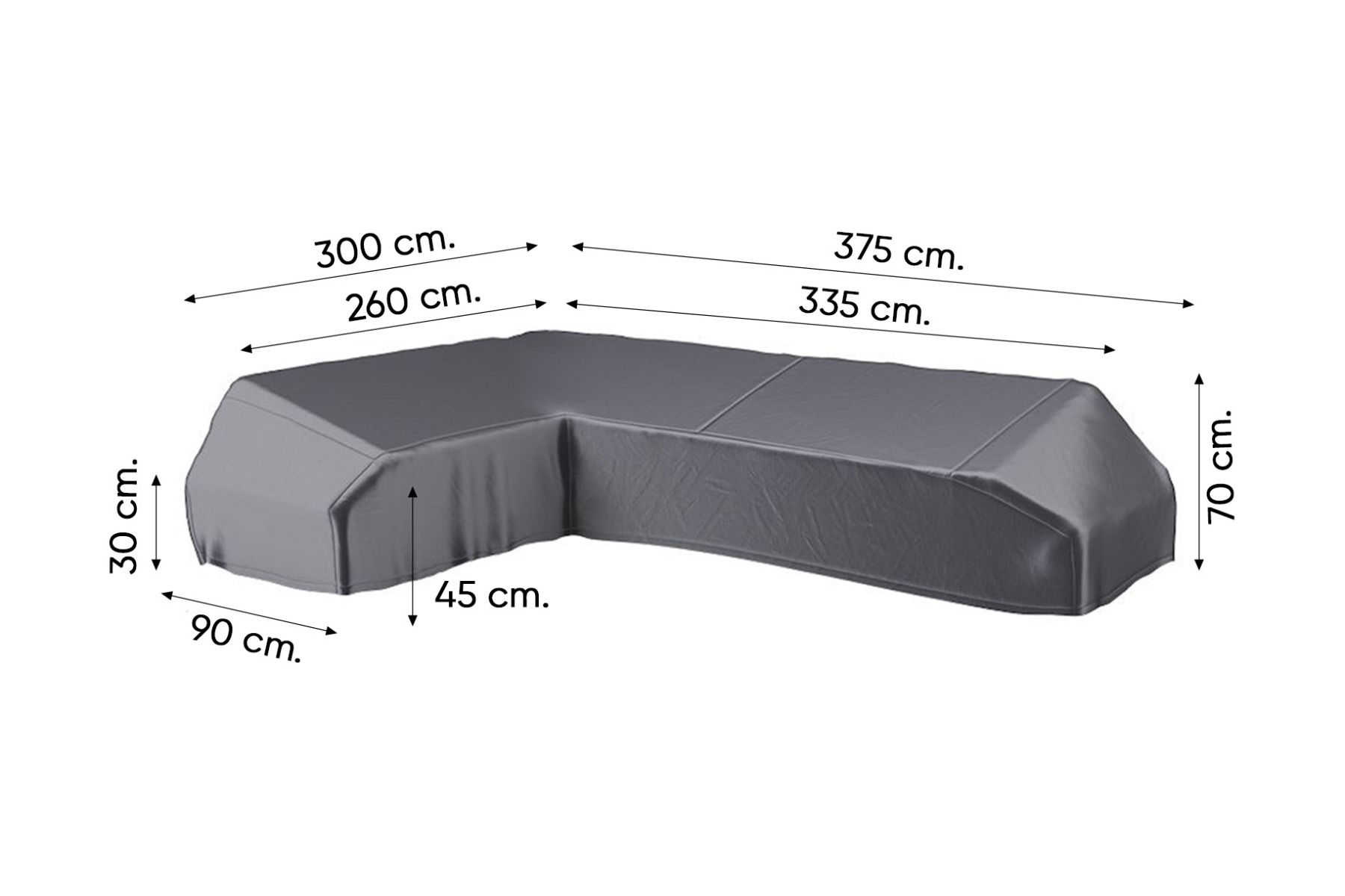 De afmetingen van de hoes zijn 375x300x90x30/45/70 cm hoog - Links