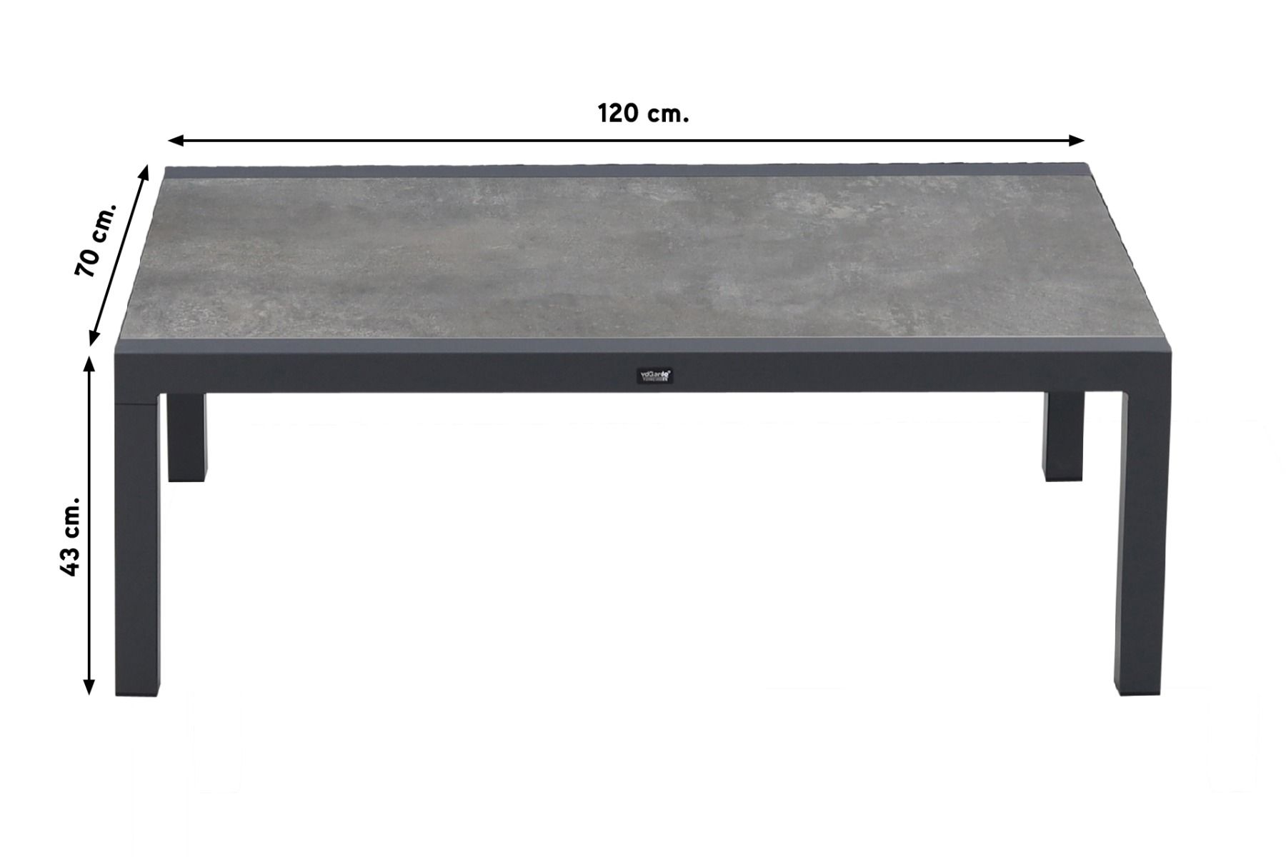 De tuintafel heeft net als de bank en de stoelen een aluminium frame. Het tafelblad is keramisch. Dit is een steen dat erg krasbestendig is en dus ook het hele jaar buiten kan blijven.Â