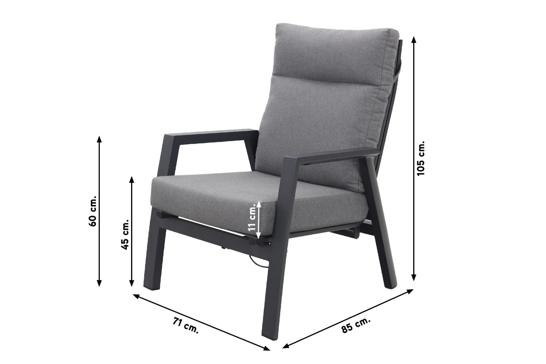 De Azoren loungestoelen zijn voorzien van een slim verstelmechanisme. Met een knop aan de binnenzijde van de armleuning verstel je de rugleuning eenvoudig naar wens, zonder dat dit ten koste gaat van het strakke design. Het stevige aluminium onderstel is voorzien van een kras- en stootvaste coating in antraciet, wat zorgt voor een robuuste en weerbestendige basis. Tussen het frame is een textileen doek gespannen dat licht meeveert, wat bijdraagt aan een prettig zitgevoel. De comfortabele grijze kussens maken het geheel af. Let op: deze kussens zijn niet waterbestendig. Berg ze na gebruik op een droge, geventileerde plek op voor een langere levensduur.