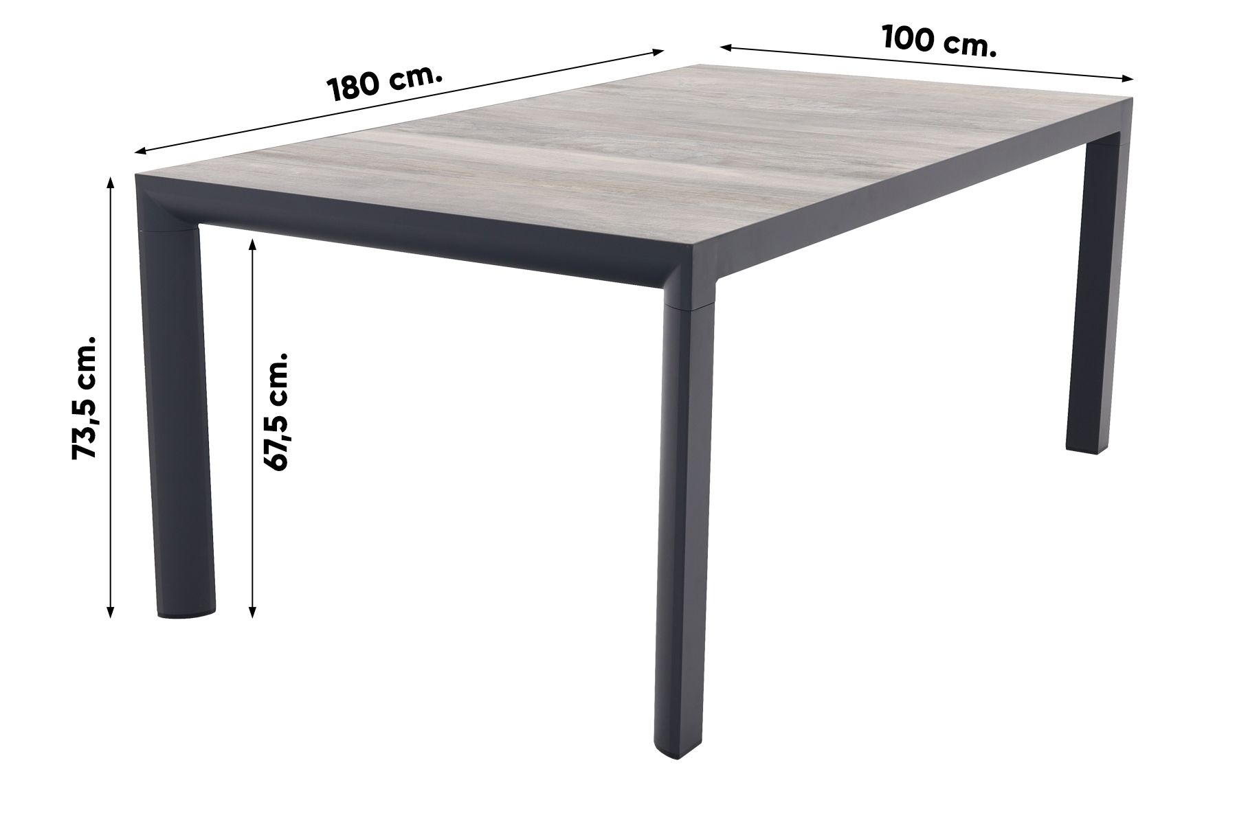 Het tafelblad van de Kings tuintafel is gemaakt van keramiek met een prachtige houtlook. Keramiek is een zeer sterk materiaal dat perfect is voor een tafelblad. Het is niet alleen duurzaam, maar ook weerbestendig, wat betekent dat het bestand is tegen regen, zon en kou. Hierdoor gaat het tafelblad lang mee en blijft het er mooi uitzien, zelfs na jaren gebruik. Het frame van de tafel is gemaakt van antraciet aluminium. Dit materiaal staat bekend om zijn stevigheid en onderhoudsgemak. Aluminium is ook weerbestendig, dus je hoeft je geen zorgen te maken over roest of verkleuring. Bovendien is het frame eenvoudig schoon te maken, wat het ideaal maakt voor buitengebruik.