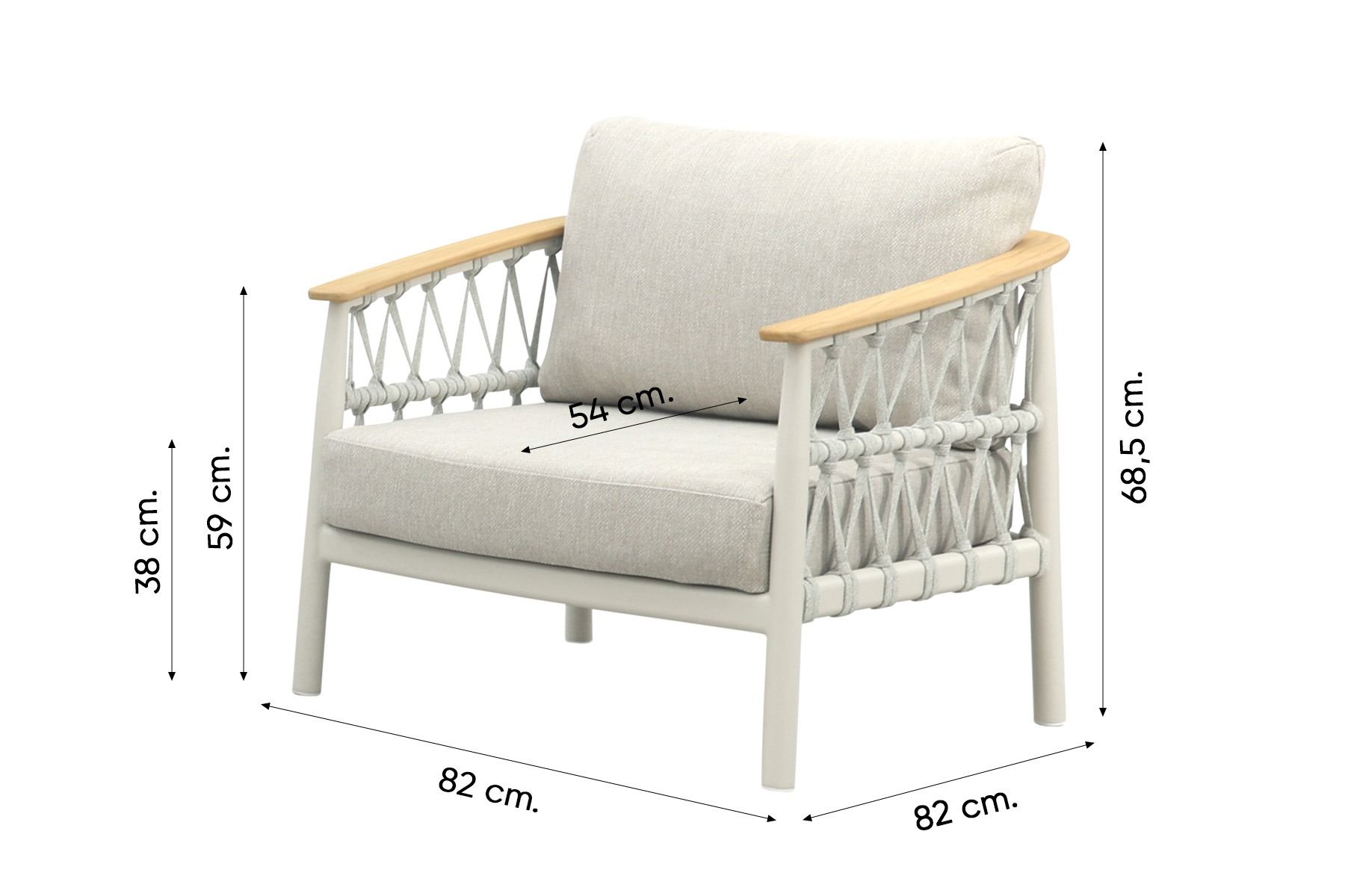 De Flora loungestoelen en -bank vallen op door het lichte gekruiste touwwerk in de rug- en armleuning. Dat rope is niet alleen een echte blikvanger, maar ook onderhoudsvriendelijk en verrassend comfortabel. De teakhouten armleuningen geven een warme, natuurlijke touch. Op de zachte polyester kussens in een zandtint kun je heerlijk lang loungen. De kussens zijn weerbestendig, maar bij langdurige regen is het slim om ze droog op te bergen of af te dekken met een hoes. Deze set is ook licht van gewicht en dus makkelijk verplaatsbaar. Bij het verplaatsen van deze set raden we aan de meubelen op te tillen inplaats van te schuiven, dat voorkomt beschadiging van je terras of de meubels.
