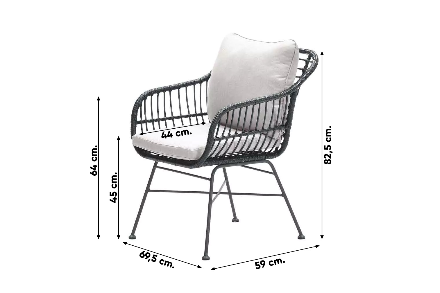 Het frame van de Margriet tuinstoel is gemaakt van staal. Een onderhoudsvriendelijk materiaal dat bestand is tegen de meeste weersinvloeden. Daarbij is het licht van gewicht en erg stevig! Om het frame is zwart wicker gevlochten. Dit geeft de unieke uitstraling aan deze stoel. De meegeleverde kussens hebben een zandkleur die helemaal van deze tijd is. De kussens hebben ook een waterafstotende coating. Dit betekend niet dat ze waterdicht zijn, wel kan je gemorst drinken er zo vanaf vegen!