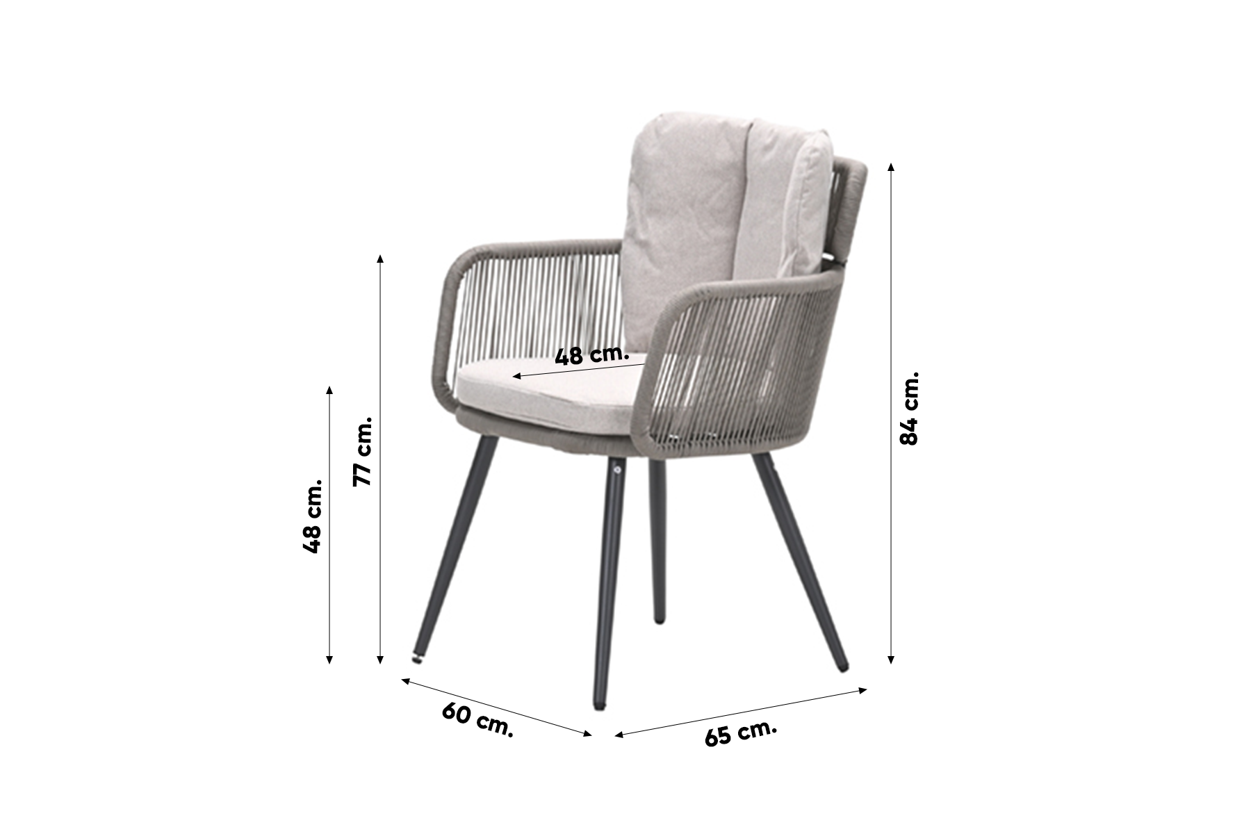 De GI Linares dining stoel is ontworpen met oog voor kwaliteit en stijl. Het stevige aluminium frame is afgewerkt met een beschermende poedercoating, waardoor de stoel duurzaam en weerbestendig is. De arm- en rugleuningen zijn stijlvol afgewerkt met handgeweven rope. Dit materiaal is perfect voor buitengebruik dankzij zijn uitstekende kleurechtheid en weerstand tegen diverse weersinvloeden. De comfortabele kussens van de Linares stoel zijn vervaardigd van waterafstotend polyester. Voor langdurig gebruik adviseren we de kussens bij slecht weer op een droge, warme plek op te bergen, aangezien ze niet volledig waterdicht zijn.