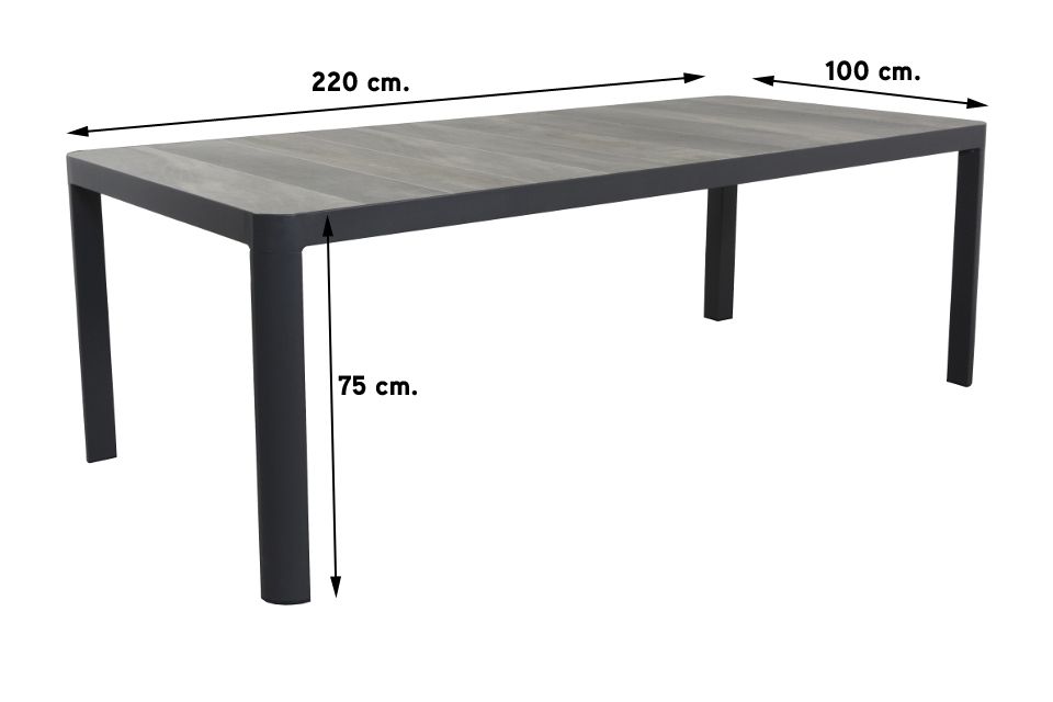 De Queens tuintafel heeft net als de tuinstoel een aluminium frame. Dit materiaal is licht in gewicht, super stevig en heeft weinig onderhoud nodig. Het frame is afgewerkt met een antracietkleurige poedercoating welke kras- en stootvast is. Het tafelblad is gemaakt van keramiek. Dit is een harde steensoort en dus perfect geschikt als tafelblad. Het keramiek heeft een houtlook waardoor de tafel een stoere uitstraling krijgt. Met zijn afmetingen van 220 x 100 cm. biedt de Queens tuintafel plaats aan 6 personen.