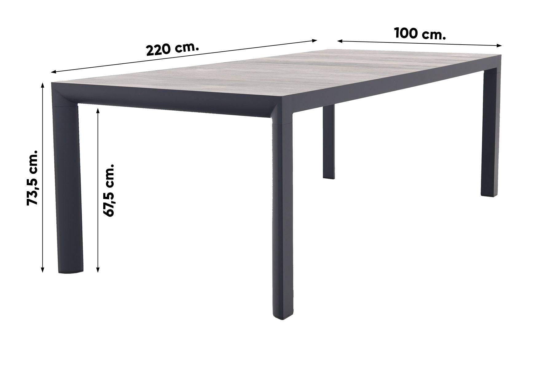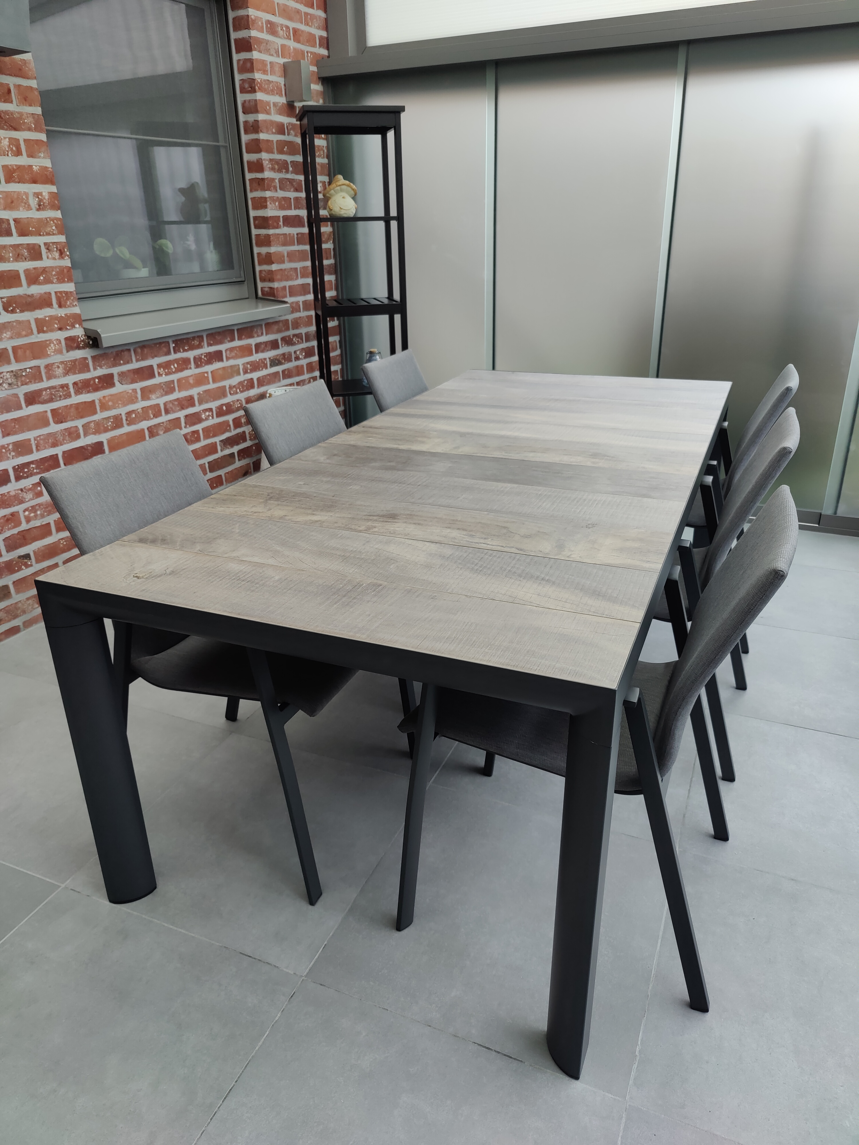 De tuintafel kenmerkt zich door zijn stoere looks en de stevigheid. Het tafelblad is gemaakt van keramiek. Keramiek is steen dat erg hard is en daarmee uitermate geschikt is als tafelblad. Dit keramiek heeft een houtlook wat de tafel een mooie uitstraling geeft. Het frame van deze tafel is gemaakt van aluminium. Aluminium is een onderhoudsarm materiaal dat bestand is tegen diverse weersinvloeden. Door het gebruik van deze twee materialen is het een onderhoudsarme tafel die langere tijd mooi zal blijven in je tuin of op je terras!Â