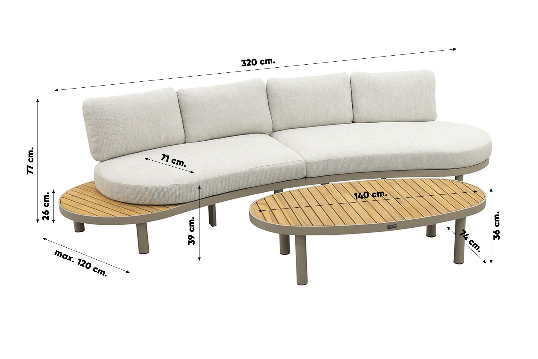 De Mira set is niet alleen mooi om te zien, maar ook praktisch en comfortabel. Het frame is gemaakt van stevig aluminium in een trendy latte kleur. Aluminium is onderhoudsvrij en roest niet, ideaal voor buiten dus. De platforms en het tafelblad van de loungetafel zijn van echt teak hout: duurzaam, stijlvol én handig als bijzettafel. De royale kussens zijn uitgevoerd in een zachte zandtint die naadloos opgaat in je tuin. Ze zijn weerbestendig, dus een buitje kunnen ze prima hebben. Maar gaat het flink regenen of wordt het herfstachtig? Dan kun je ze het beste even droog opbergen om ze mooi te houden. Deze set is helemaal van nu: organische vormen, natuurlijke materialen en doordacht design.