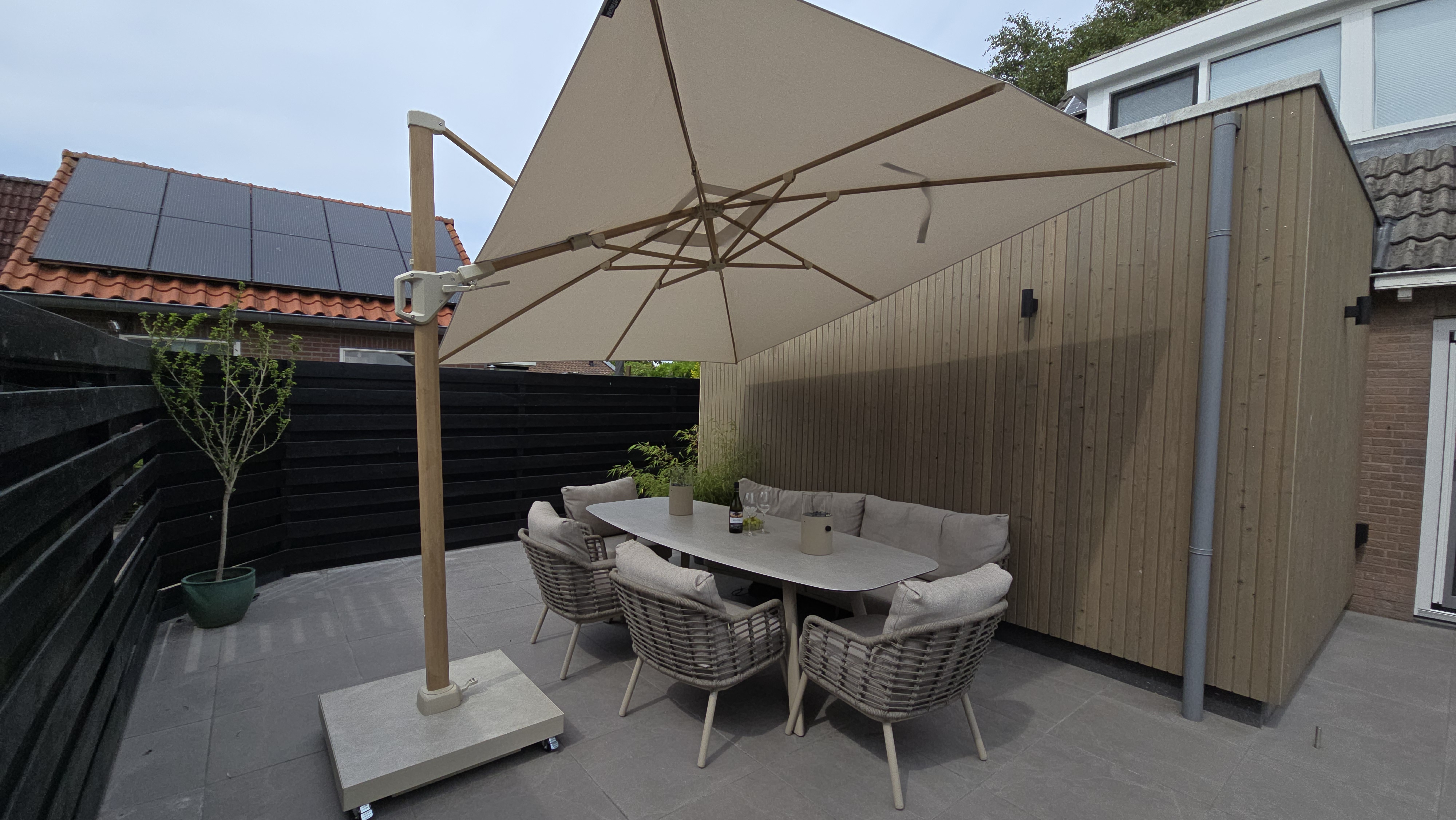 Ervaar buitenleven met een schaduwrijke plek door de Platinum Challenger Premium T2 zweefparasol (3,5x2,6m). Deze hoogwaardige parasol combineert een elegant aluminium teaklook frame en een champagnekleurig doek, wat zorgt voor een verfijnde uitstraling in je tuin. Dankzij de kantelfunctie en 360 graden draaibaarheid geniet je altijd van optimale schaduw. Het stevige UV-bestendige doek beschermt je tegen 98% van de schadelijke stralen en wordt geleverd met een waterdichte en ademende beschermhoes. De verrijdbare, vulbare parasolvoet met luxe keramische afwerking maakt verplaatsen eenvoudig en biedt een stabiele basis. Bestel deze eyecatcher eenvoudig online of bezoek één van onze showrooms in Opheusden, Duiven of Apeldoorn om de parasol in het echt te bekijken!