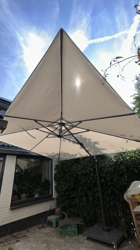 Super fijne oplossing voor een terras dat is ingebouwd, met uit-stekende dakgoten die ook nog eens laag zijn. Ik kan hier nu gemakkelijk mijn workshops beeldhouwen geven; de parasol is kantelbaar, de ruimte eronder vrij, en de champagnekleur prachtig neutraal zodat het binnen niet te donker wordt.