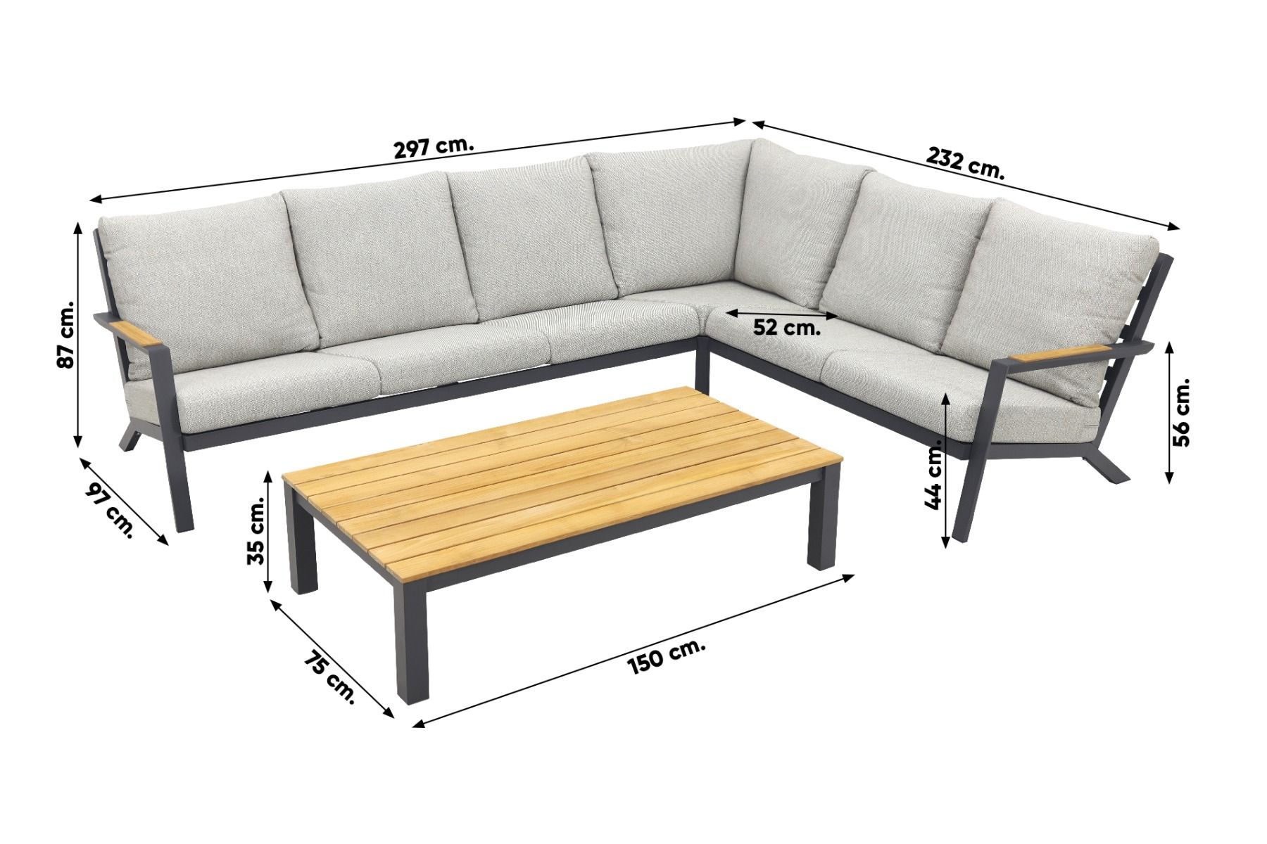 De Santos loungebank is de perfecte combinatie van duurzaamheid en comfort. Gemaakt uit hoogwaardig aluminium biedt het frame een moderne uitstraling en stabiliteit. Deze loungebank staat bekend om zijn flexibiliteit. Je kunt namelijk zelf bepalen of de lange kant aan de linker- of rechterzijde wordt geplaatst. Op de armeuningen is een teakhouten detail gemaakt. Dit voegt een stukje warmte toe aan deze loungebank. De grijze kussens nodigen uit om heerlijk in weg te dromen. Dat is ook zeker mogelijk met het hoge zitcomfort van deze kussens.