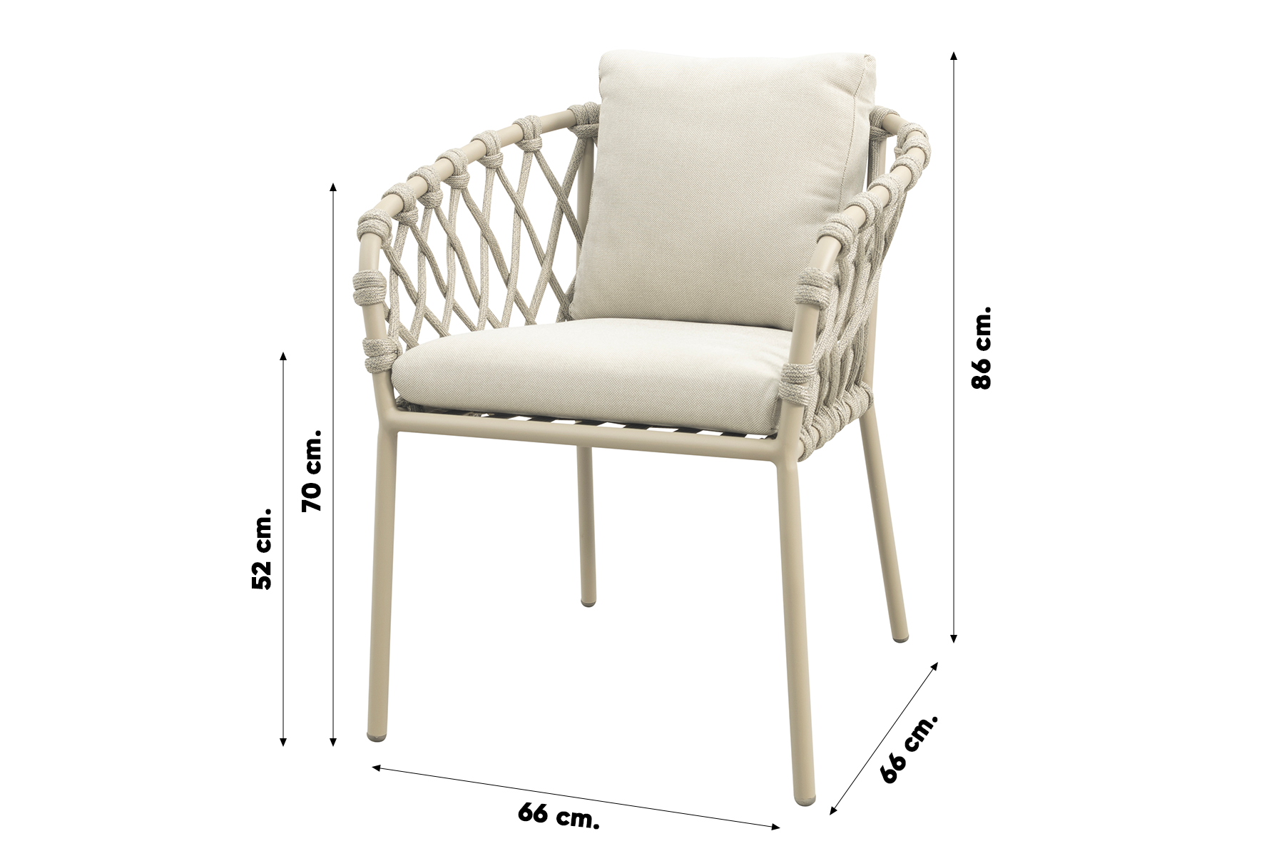 De Sara stoel is licht van gewicht, stevig en gemaakt voor buiten. Het aluminium frame in latte geeft een zachte, moderne uitstraling die makkelijk te combineren is met andere tuinmeubels. Het touwwerk (rope) in zandkleur zorgt voor een speelse, luchtige look, en de dikke kussens bieden top zitcomfort. Alles bij elkaar: een stijlvolle én praktische keuze voor wie graag buiten geniet in stijl.