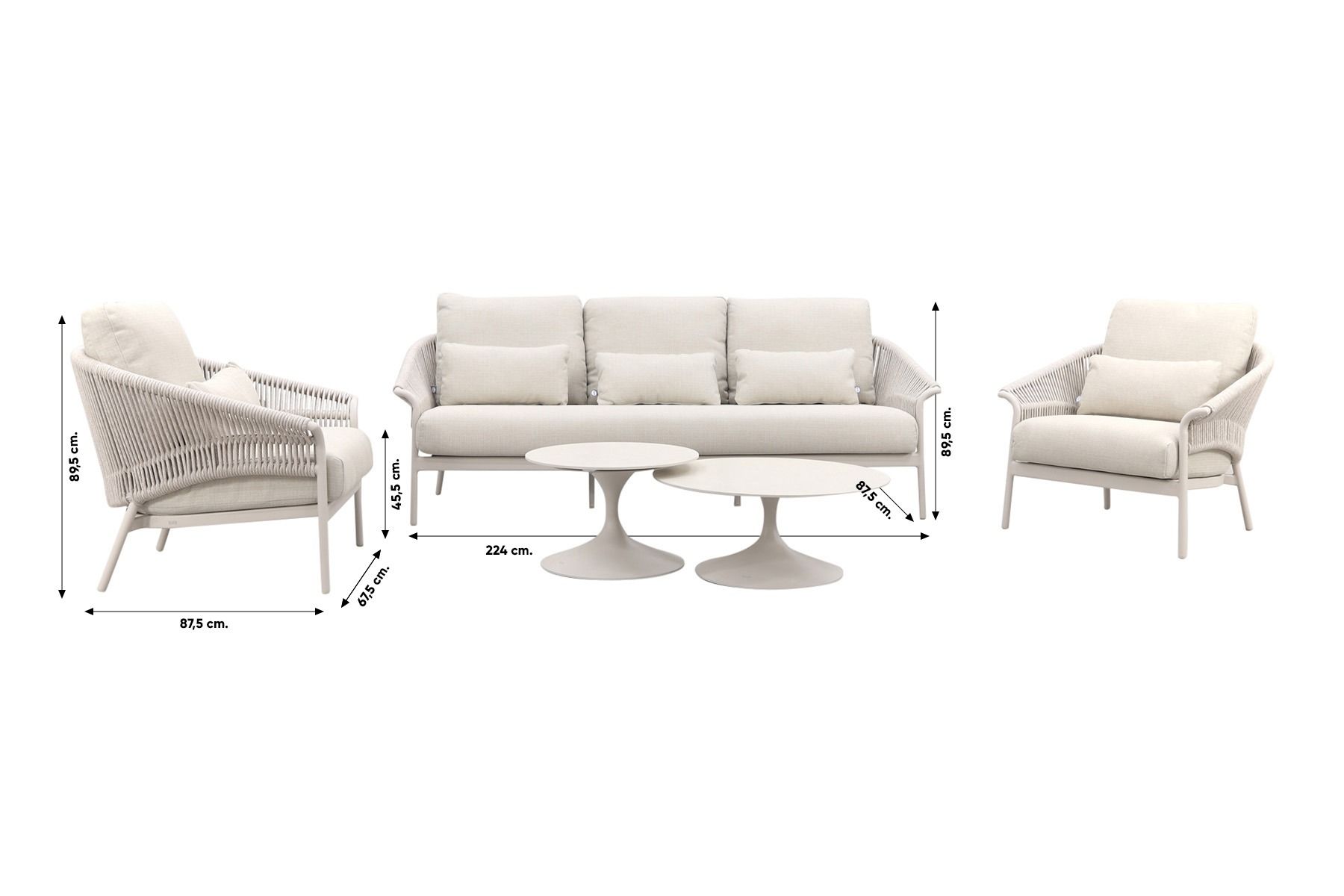 De exclusieve Suns Santorini loungeset combineert hoogwaardig aluminium en duurzaam rope. Het aluminium frame is voorzien van een dubbele coating voor extra stabiliteit en optimale weerbestendigheid. Het zorgvuldig geweven rope is niet alleen stijlvol, maar ook slijtvast, kleurvast en bestand tegen diverse weersomstandigheden. De luxueuze kussens, afgewerkt met een premium outdoor stof. De stof is water-, UV- en schimmelbestendig.