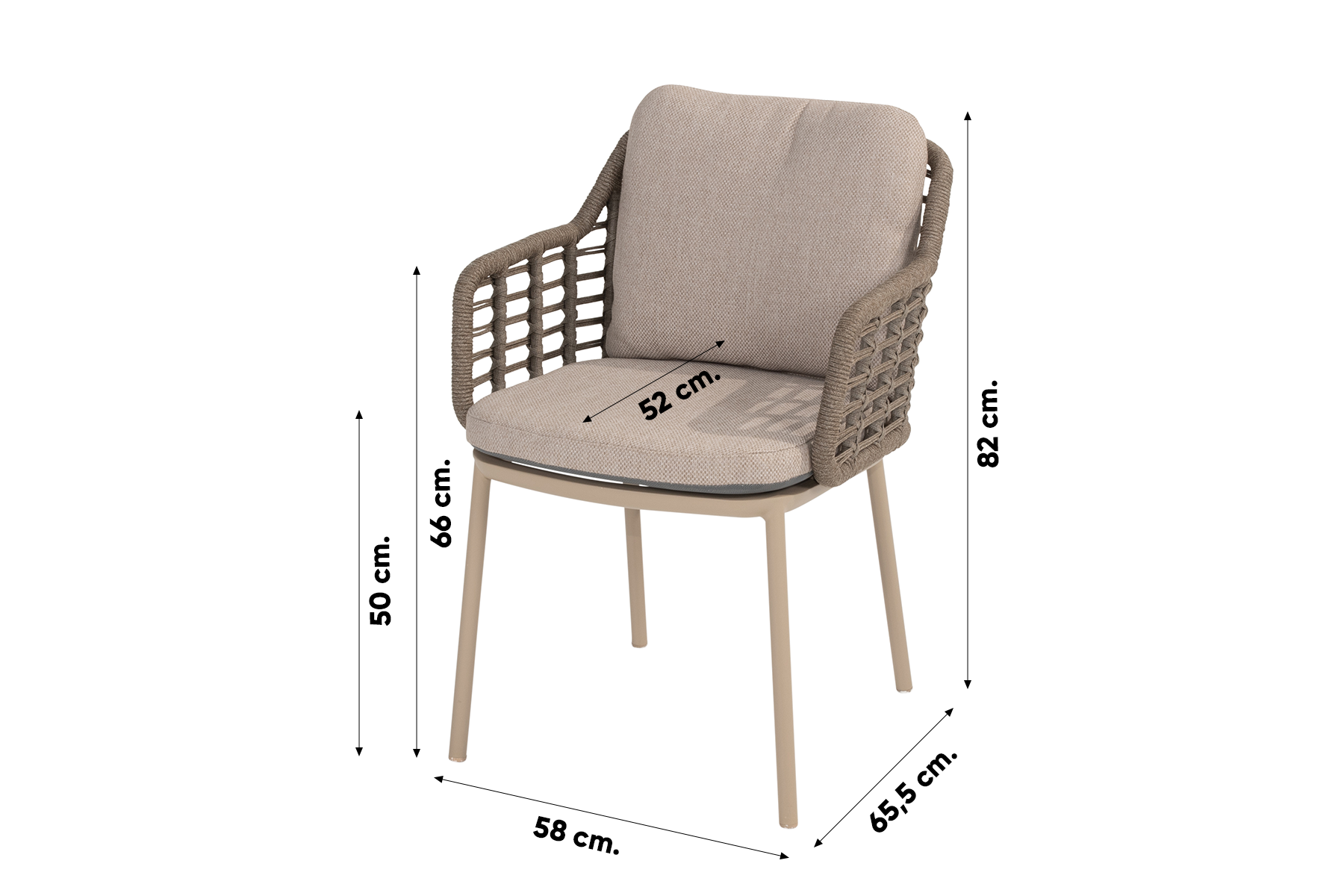 De Taste Puglia dining tuinstoel is een prachtige combinatie van een latte-kleurig aluminium frame en rope. Aluminium wordt veel gebruikt bij tuinstoelen, omdat het materiaal erg stevig en onderhoudsvriendelijk is. Om het frame is rope, een weerbestendig touw, gebonden in een uniek ontwerp. Zonder kussens kan de tuinstoel gedurende het hele jaar buiten blijven staan. Qua onderhoud aan de stoel ben je niet veel tijd kwijt, waardoor je langer kunt genieten van de comfortabele tuinstoel.
