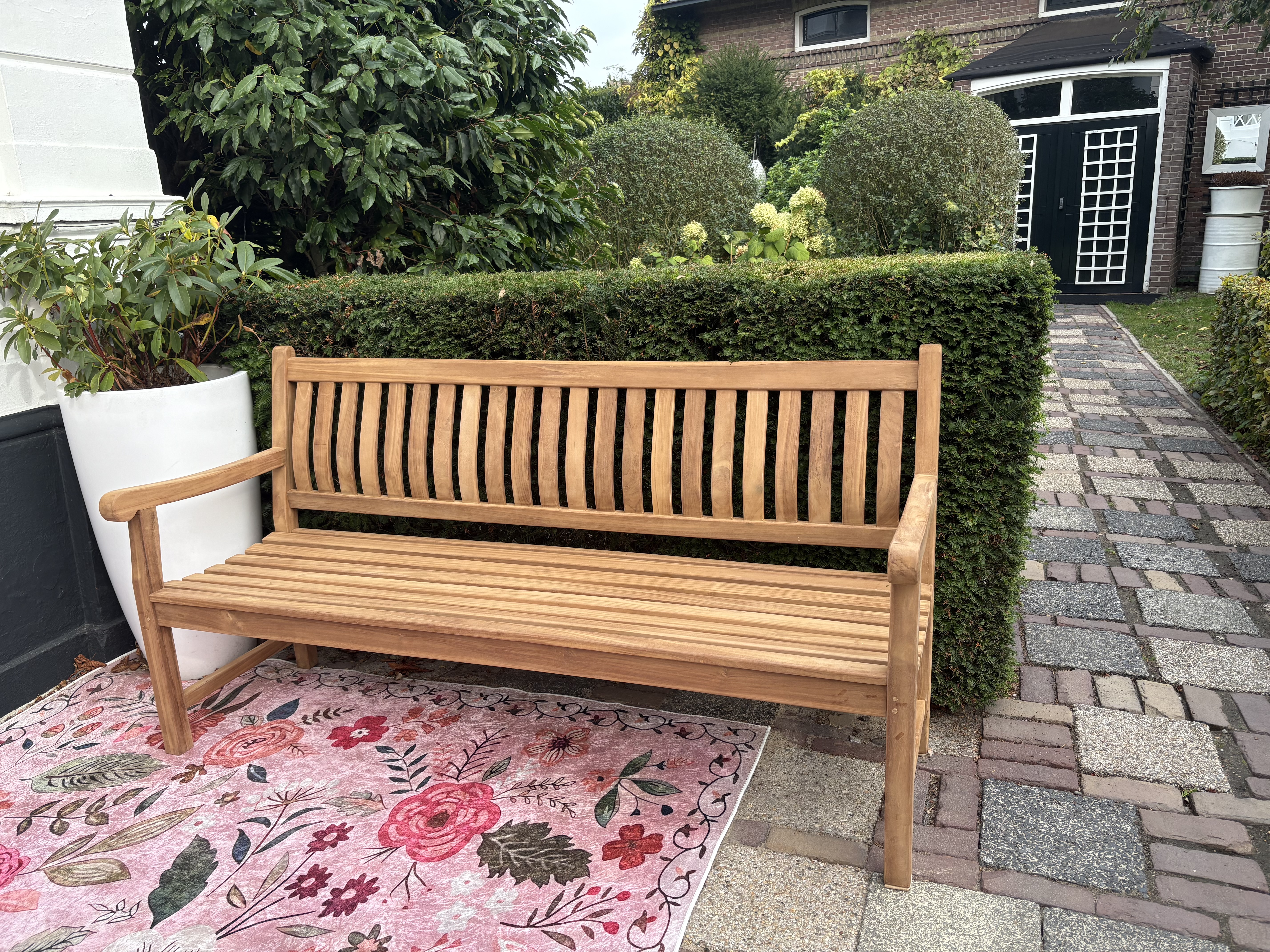Deze bank, gemaakt van robuust teakhout, is uitstekend bestand tegen de wisselvallige Nederlandse weersomstandigheden. Teakhout is een dicht hardhout met natuurlijke oliën, wat het bijzonder duurzaam en onderhoudsarm maakt. Door het hout regelmatig schoon te maken met een zachte borstel en wat water, blijft het in topconditie. Om de warme kleur van het hout te behouden en vergrijzing te voorkomen, kun je de bank behandelen met Teak Protector.